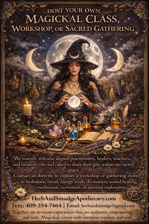 At Herb & Smudge Apothecary, our classes are an extension of the Magick we share in the shop—intentional, hands-on, and rooted in ancient wisdom and modern practice. From herbalism and apothecary arts to energy work, ritual, and spiritual exploration, each class is designed to empower your path and deepen your connection to self and spirit.