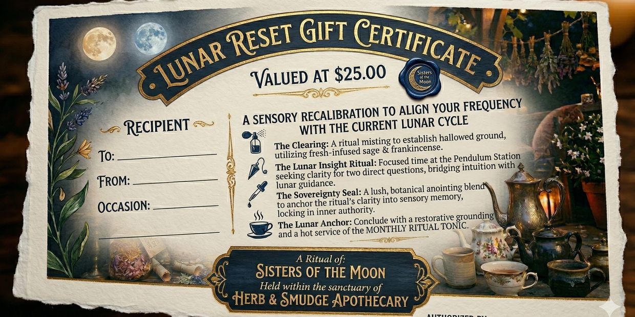 IV. THE LUNAR ANCHOR A restorative grounding. Conclude your reset with a warm infusion of the Sisters of the Moon Monthly Tea. This final step ensures the high-vibe energy of your session is fully integrated and anchored into your physical vessel before you return to the world.